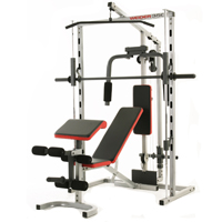 En photo à gauche, il s'agit du Smith Machine Weider 350 trouvable à environs 600 euros. Vous avez ici de quoi travailler tous les groupes musculaires, une véritable salle de musculation à domicile.